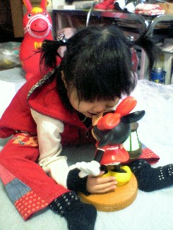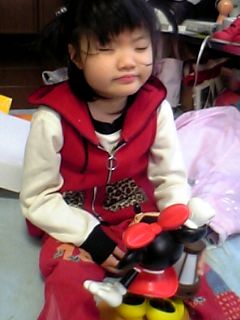 れいちゃんすごーく気に入って、ミニーちゃんの鼻の頭をかぷっ!